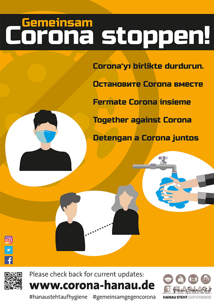 Menschen aus mehr als 140 Herkunftsländern leben in der Brüder-Grimm-Stadt. Ganz im Sinne des Mottos „Wir lassen niemand allein“ hat es sich das vom Krisenstab der Stadt Hanau seit Frühjahr eingesetzte Hygiene-Team zur Aufgabe gemacht, die Bürgerinnen und Bürger auch in mehreren Sprachen zu informieren.